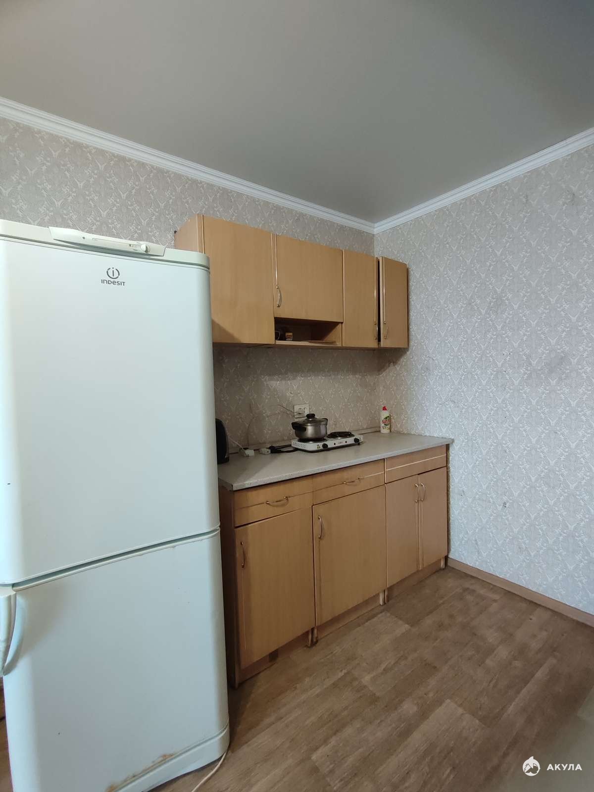 Окно пластиковое, полы линолеум, кухонная зона в правом ближнем углу, есть электрическая плитка двухкомфорчатая.